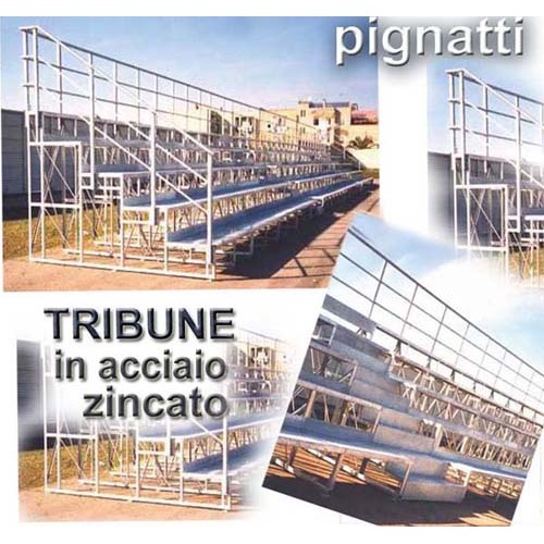 Tribuna a 3 ordini di posti,lungh.mt.4. Struttura portante in acciaio zincato a caldo, interam.smontabile,completa di corrimano/ringhiera +scale accesso/deflusso+camminamenti in allum.mandorlato+Sedute allum.liscio (a richiesta sedute PVC c/magg.prezzo). Totale posti / capacita' 36 posti -